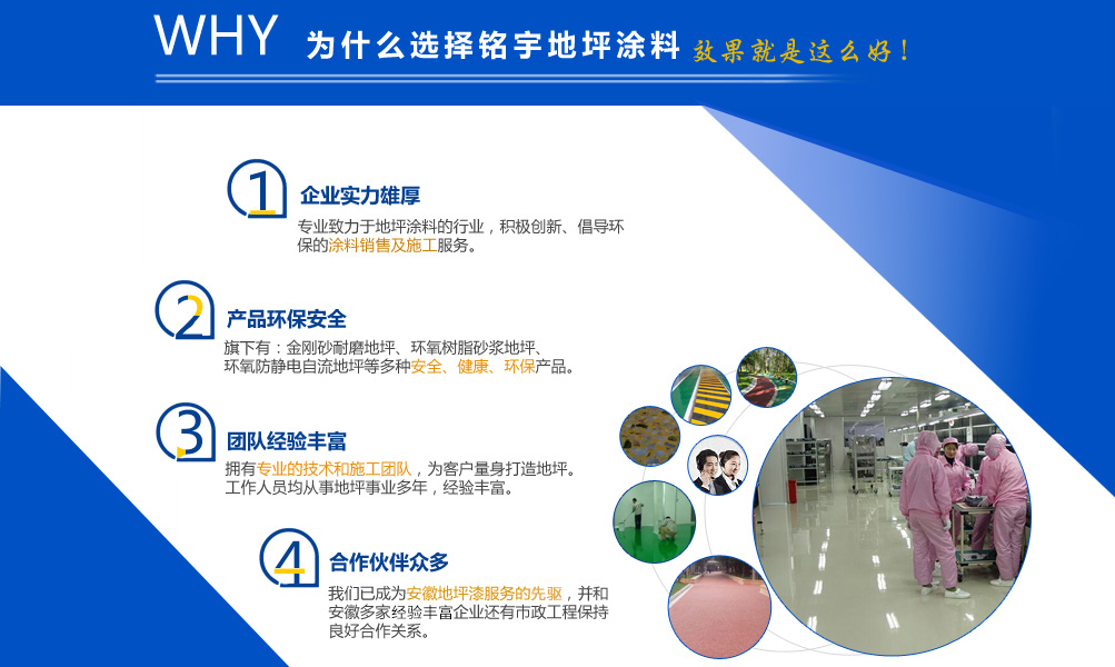 安徽銘宇建材科技有限公司是一家致力于地坪涂料的行業(yè),旗下有金剛砂耐磨地坪,環(huán)氧樹脂砂漿地坪,環(huán)氧防靜電自流地坪,停車場(chǎng)防滑地坪,混凝土密封固化劑和丙烯酸球場(chǎng),無震動(dòng)止滑車道、塑膠跑道、工廠地板漆等工程施工服務(wù)。 憑借本身的技術(shù)能力和研發(fā)條件,加上多年對(duì)環(huán)氧地坪和耐磨硬化地坪等各類工業(yè)地坪的涂裝、施工的實(shí)踐經(jīng)驗(yàn)、技術(shù)己處于國(guó)內(nèi)專業(yè)水平,經(jīng)檢測(cè)機(jī)構(gòu)檢驗(yàn)符合相應(yīng)的技術(shù)標(biāo)準(zhǔn)。同時(shí)安徽銘宇建材科技有限公司還組建了經(jīng)驗(yàn)豐富的工程技術(shù)隊(duì)伍以及工程施工隊(duì)伍、簡(jiǎn)歷了完善的售后施工服務(wù)體系,滿足用戶的需要。 安徽銘宇建材科技有限公司是一家積極創(chuàng)新、倡導(dǎo)環(huán)保的涂料銷售及施工服務(wù)的廠家,安徽銘宇建材科技有限...